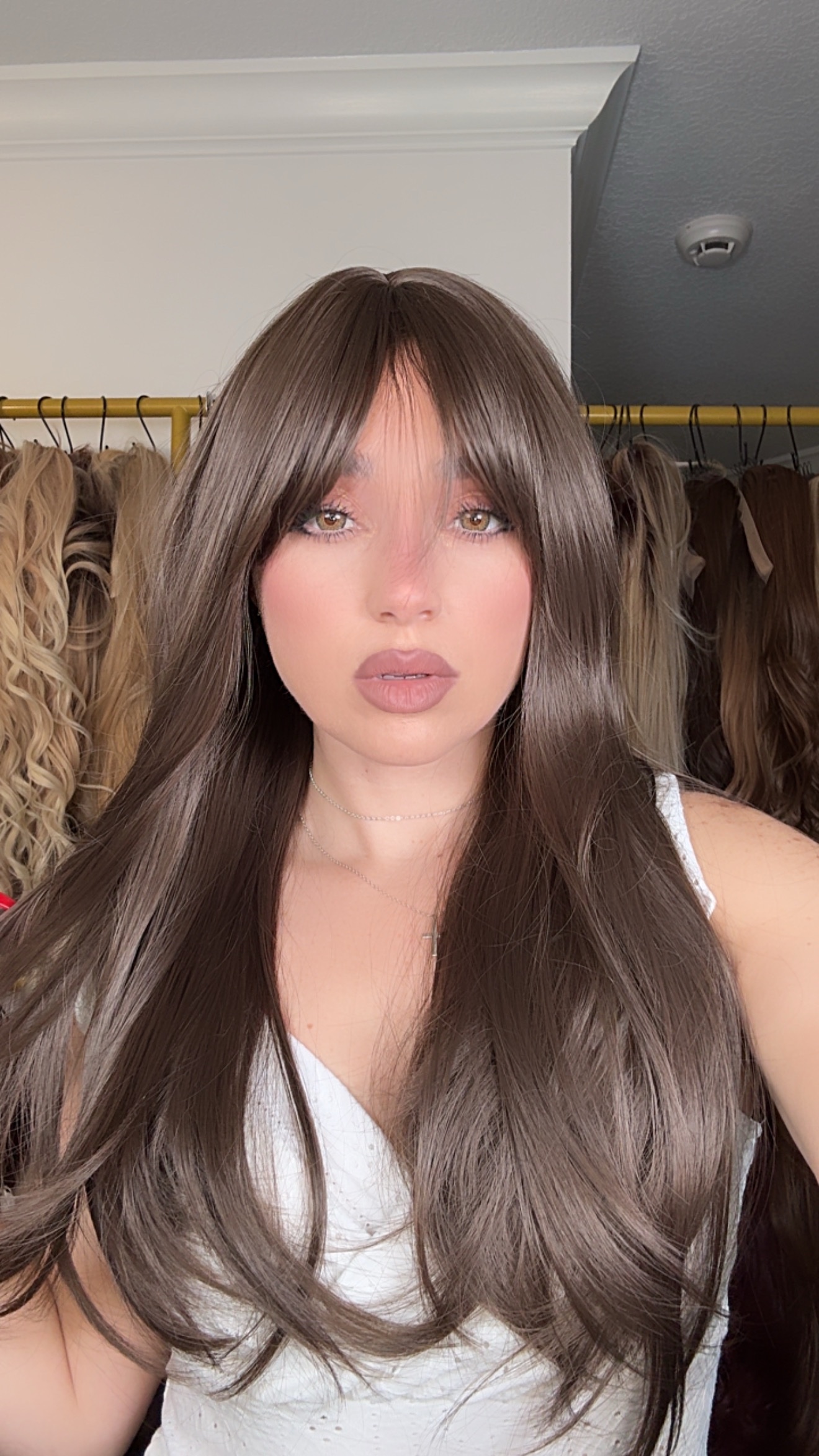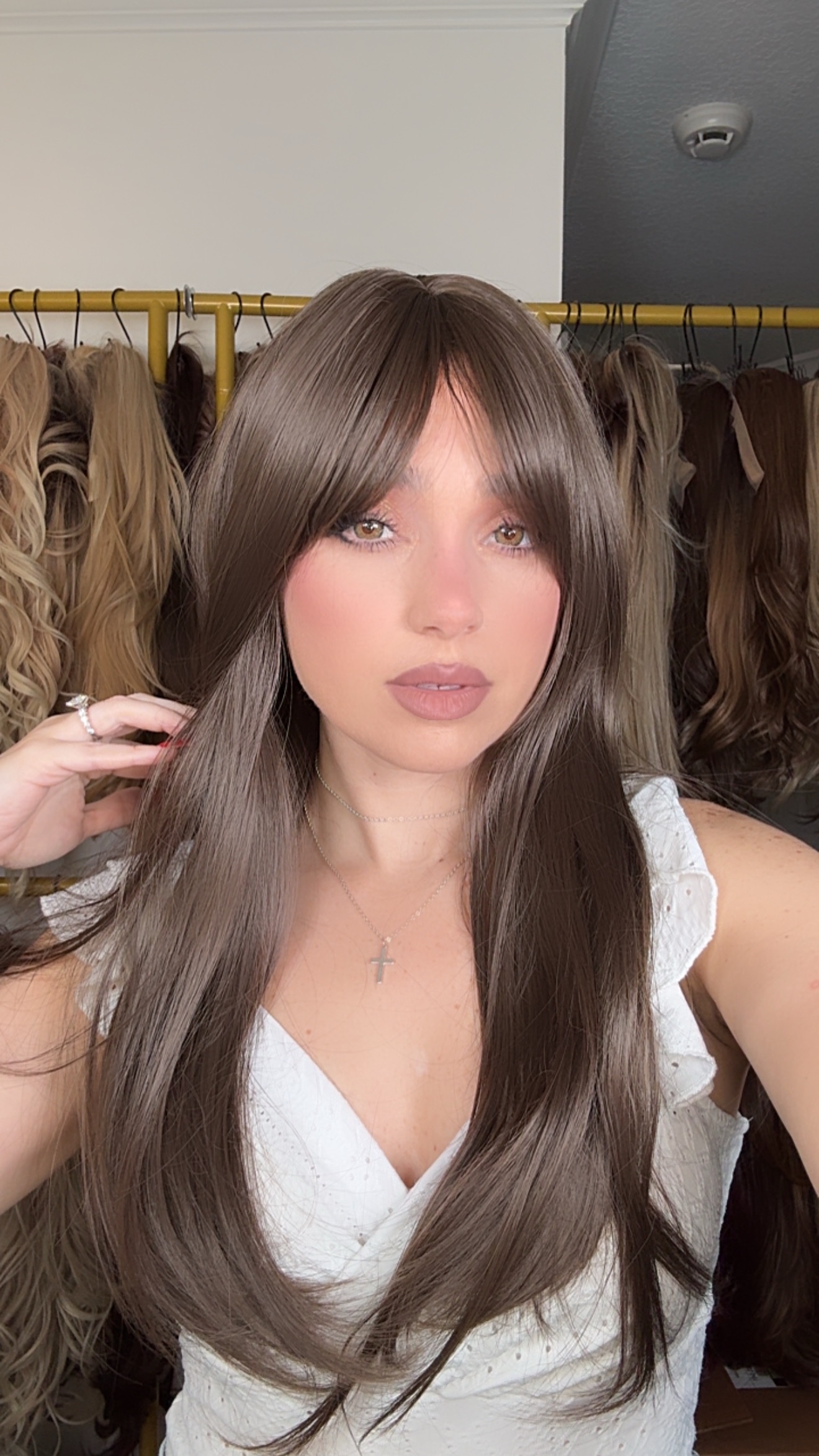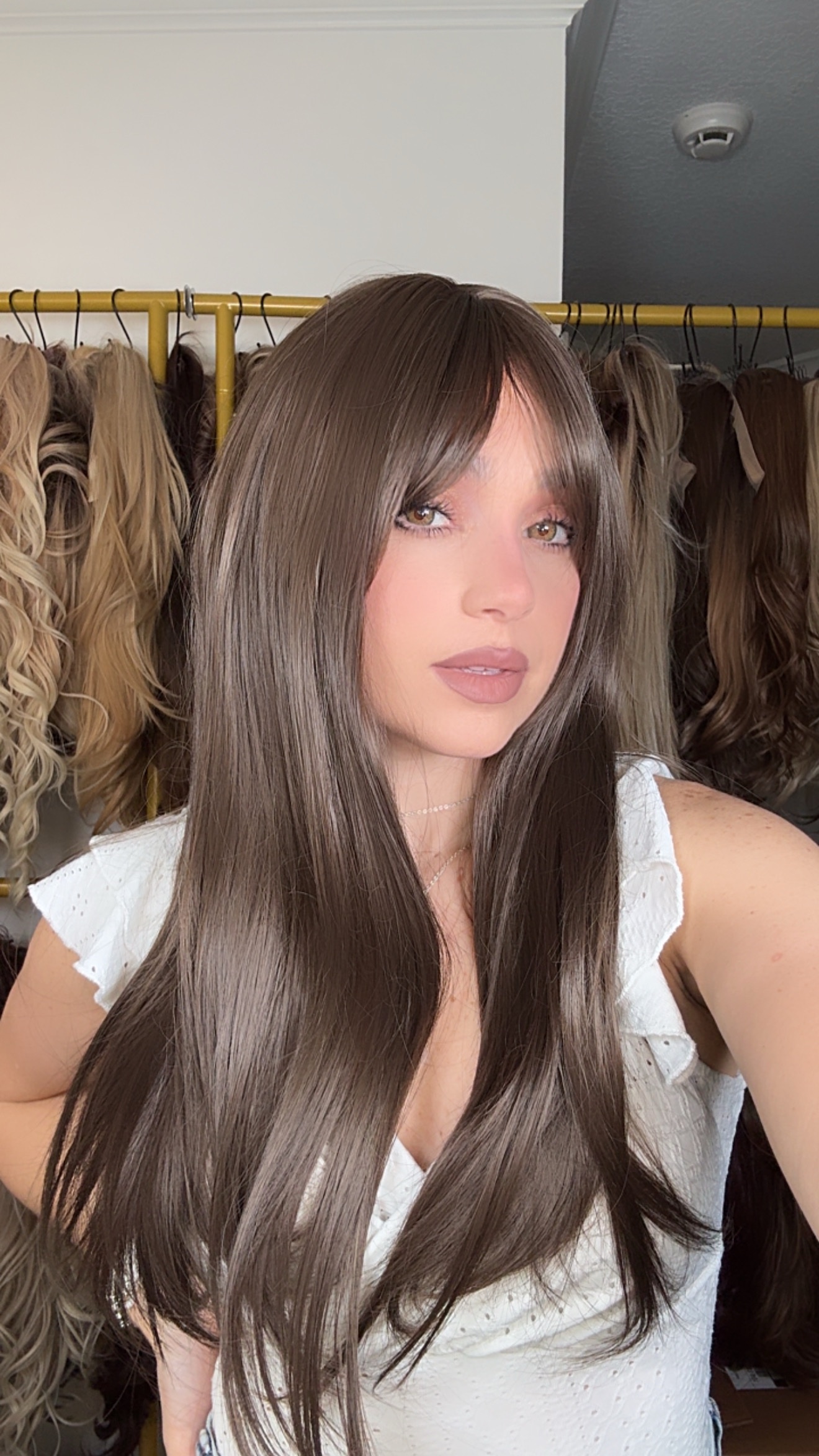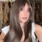 Introducing the stunning EllaRae Dakota Style Wig – your ultimate solution for a quick and stylish hair transformation. She is designed in a sophisticated Brunette color, featuring a straight long length cut complemented by long layers and bangs that frame the face elegantly.