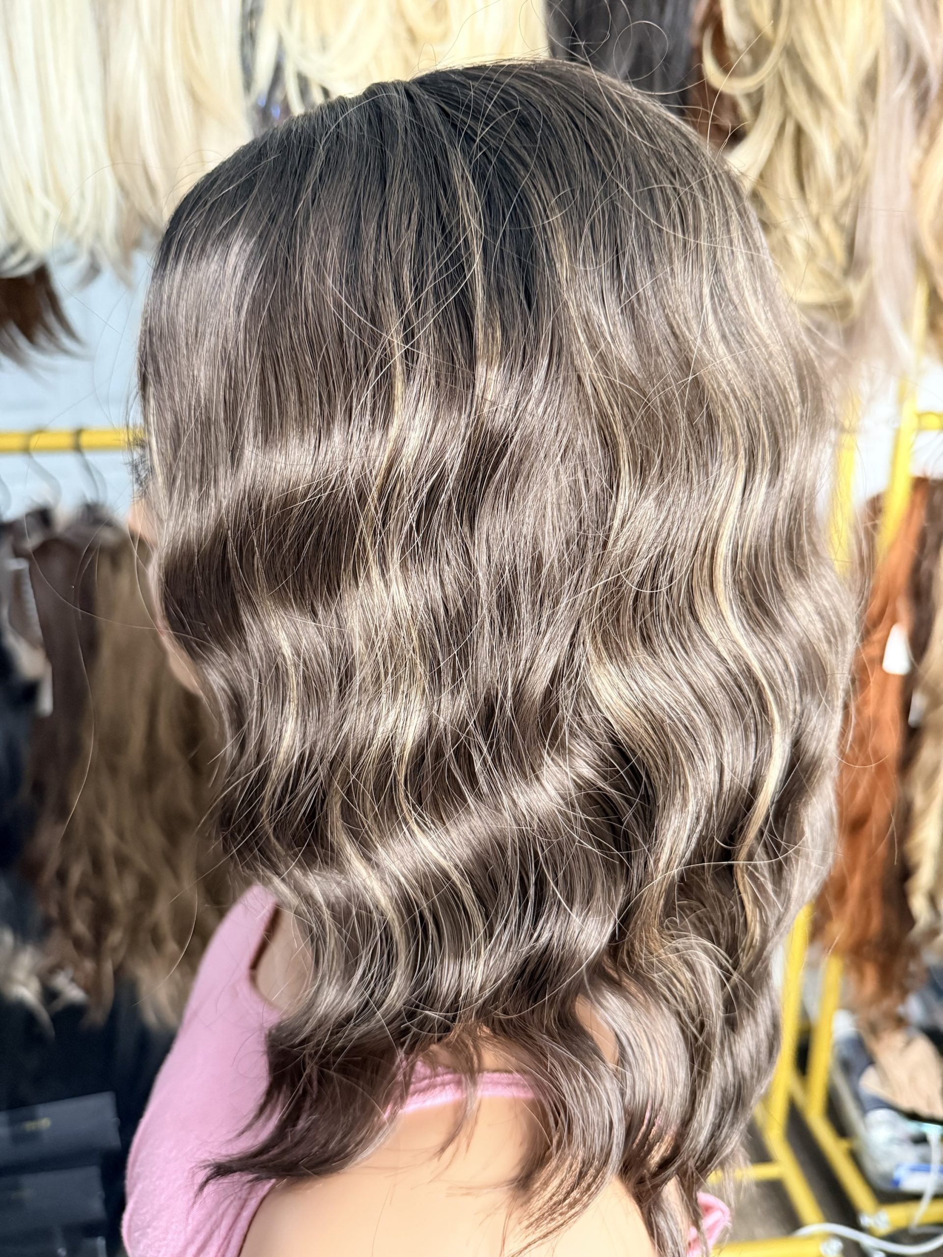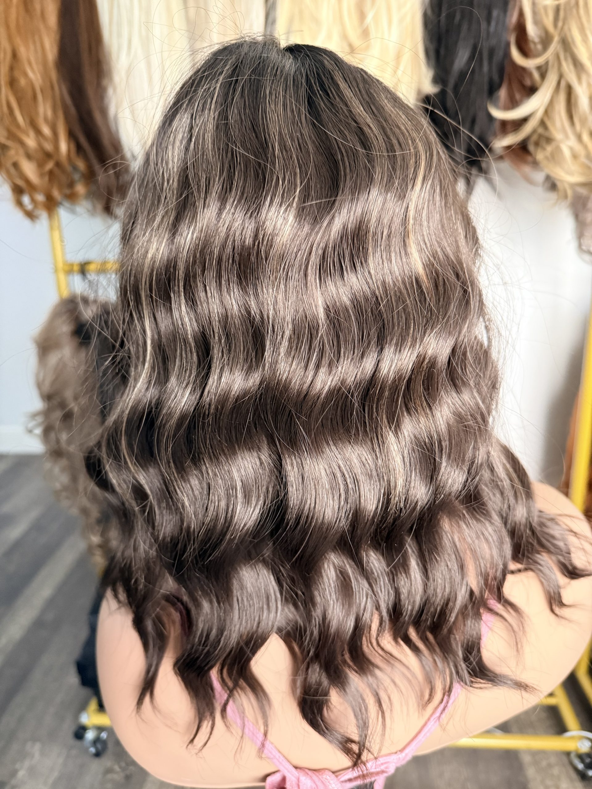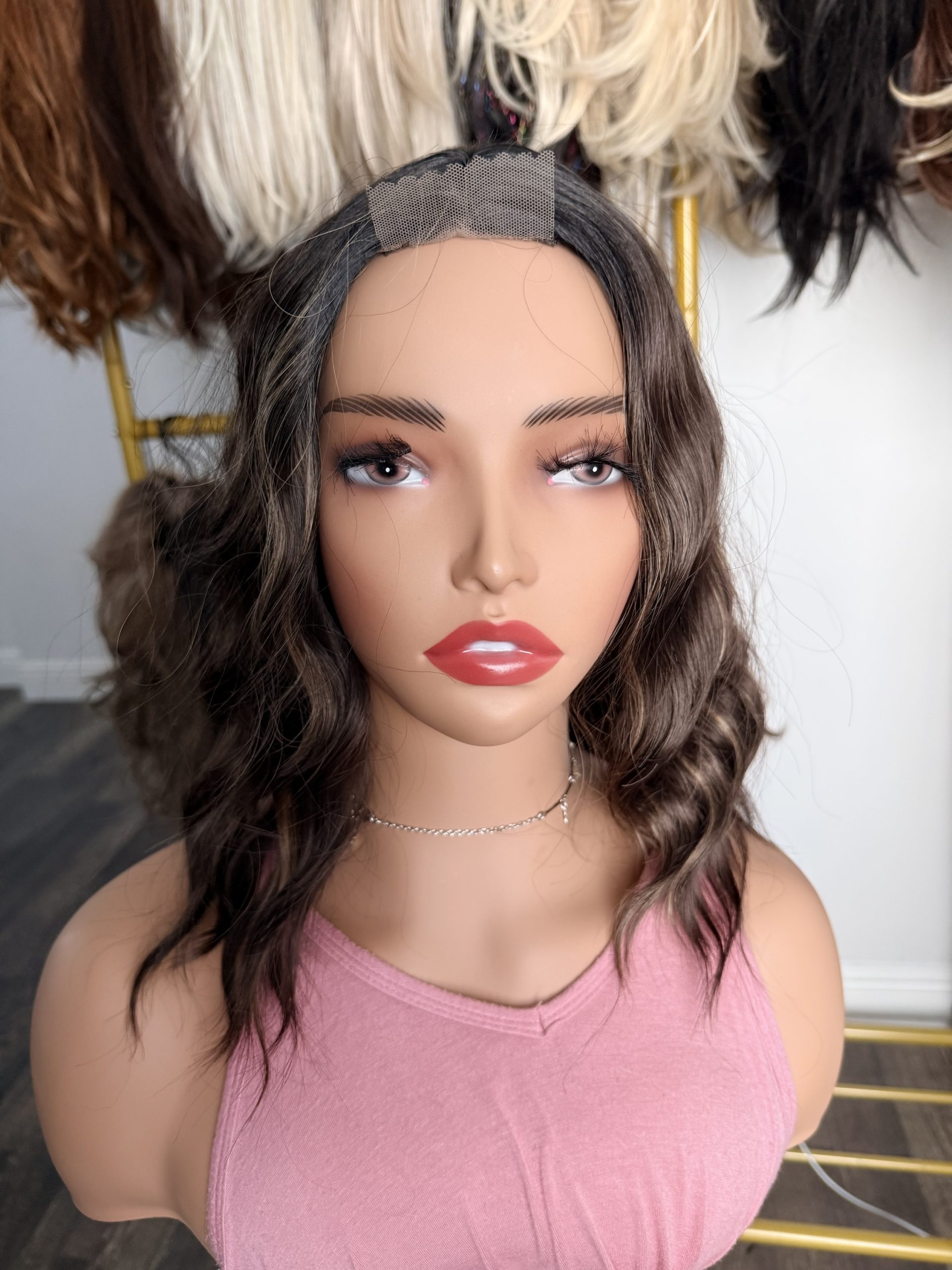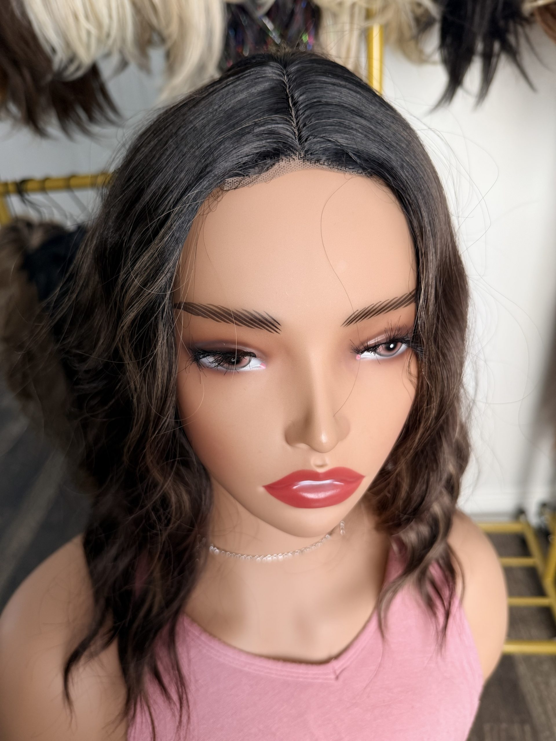 Introducing the stunning EllaRae Demi Style Wig – your ultimate solution for a quick and stylish hair transformation. She is designed in a sophisticated Brunette with highlights. Demi features a wavy bob with Bangs.