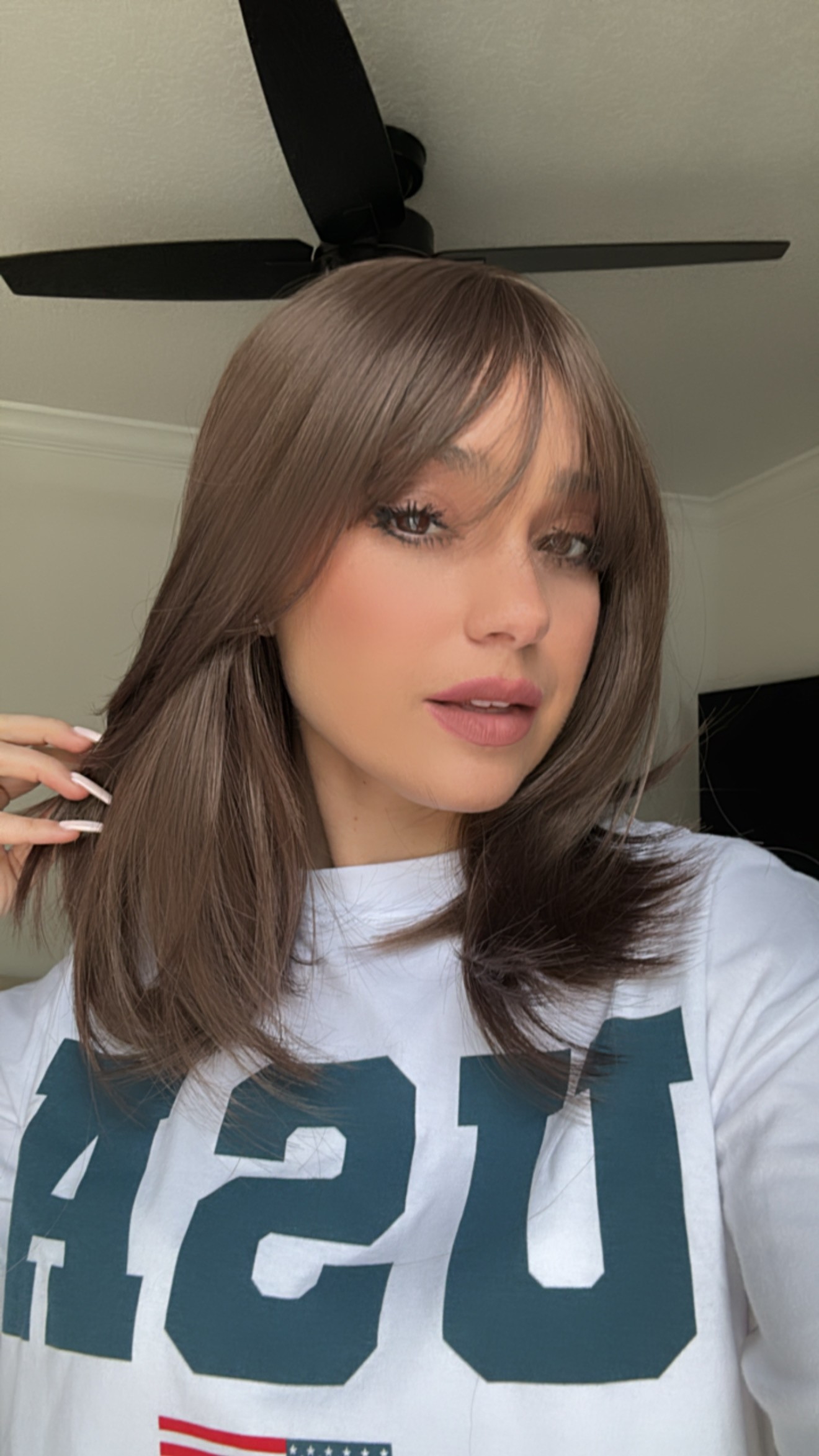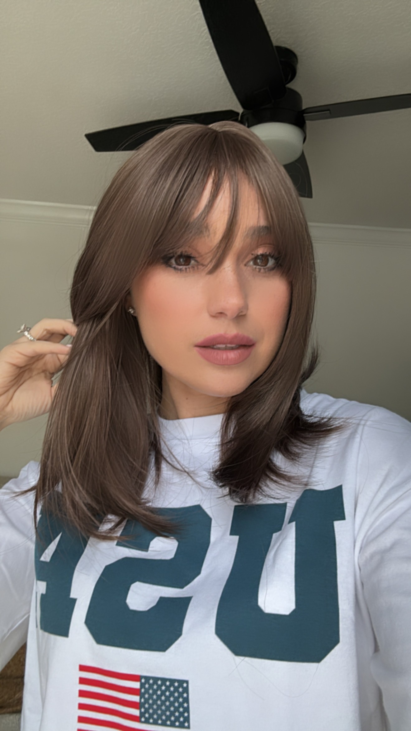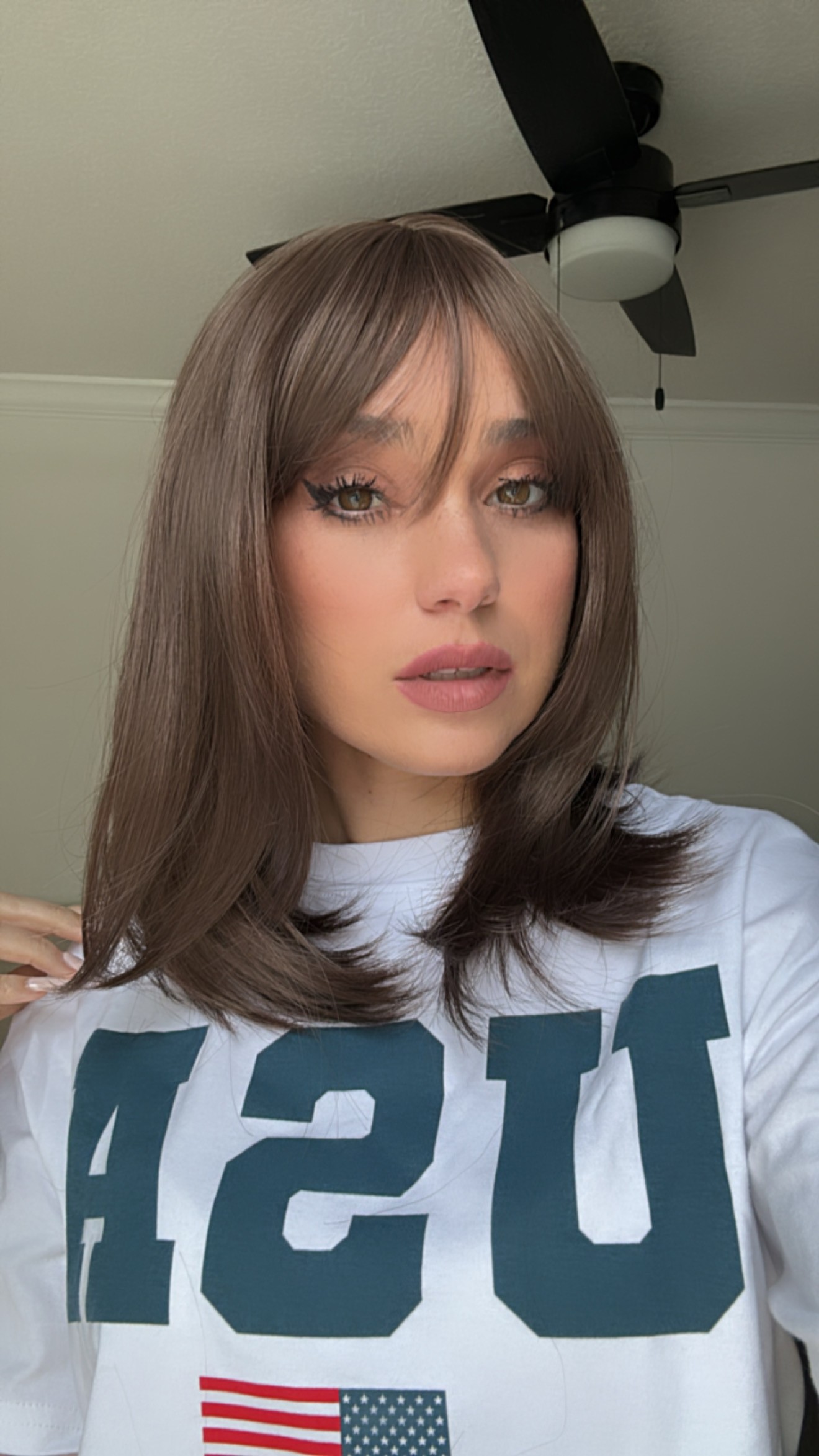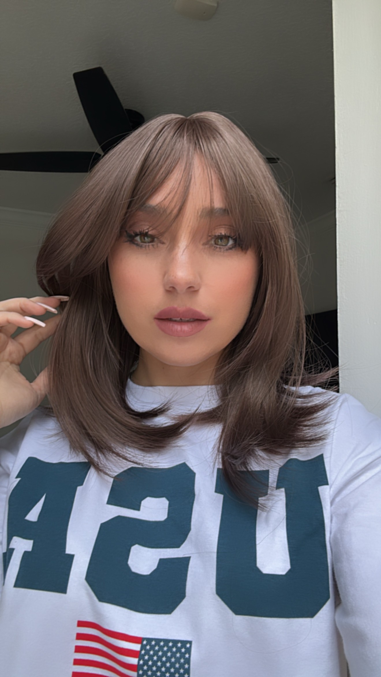 Introducing the stunning EllaRae Ivy Style Wig – your ultimate solution for a quick and stylish hair transformation. She is designed in a medium brown with subtle purple highlights and layers to frame layers.