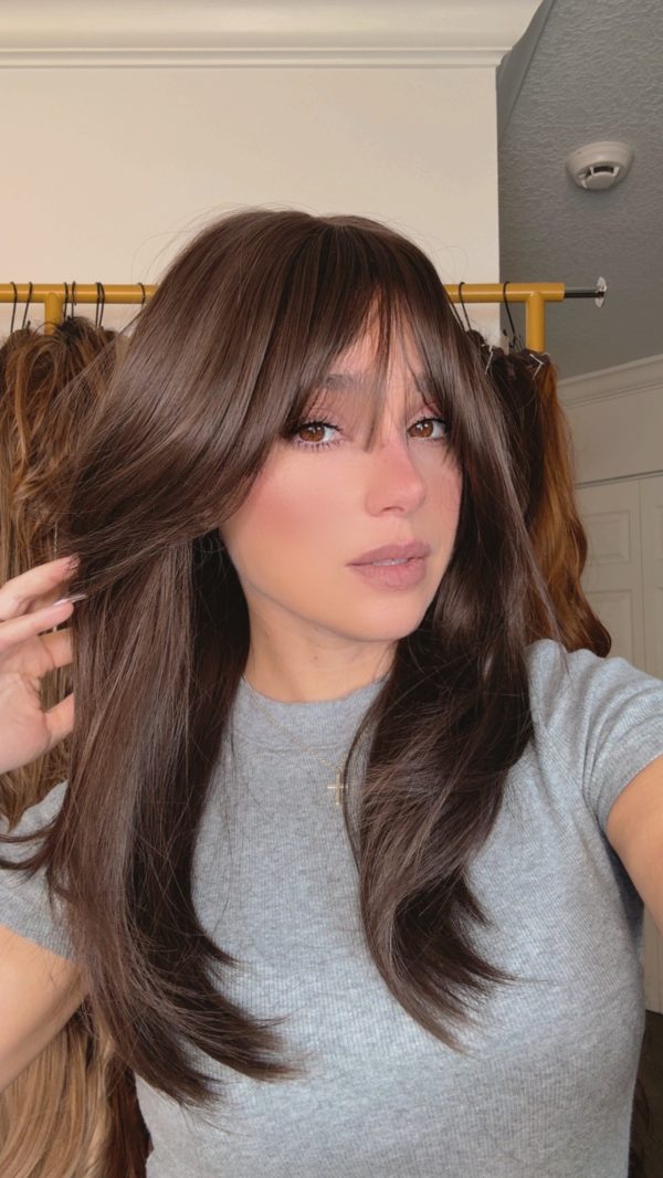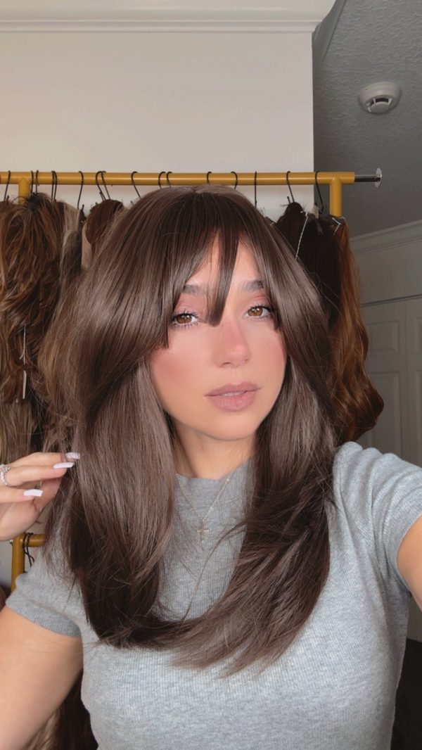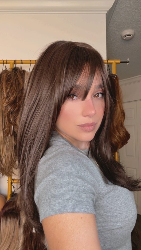 Introducing the stunning EllaRae Jenn Style Wig – your ultimate solution for a quick and stylish hair transformation. This beautifully crafted wig is designed in a sophisticated brunette, featuring a straight, mid-length cut complemented by chic bangs that frame the face elegantly.