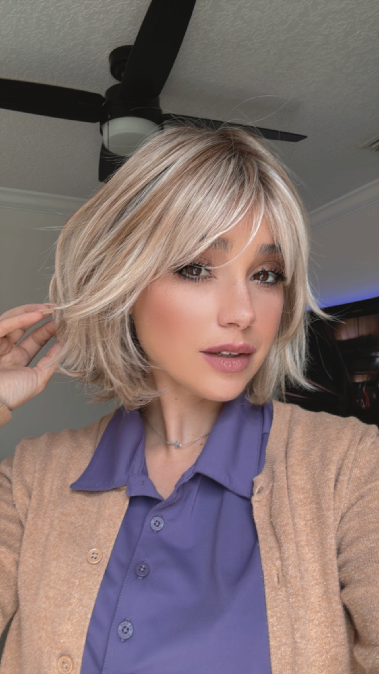 Introducing the stunning EllaRae Maddy Style Wig – your ultimate solution for a quick and stylish hair transformation. She is designed in a sophisticated Platinum blonde with shadow rooting, featuring a mid- length cut complemented by layers that frame the face elegantly.