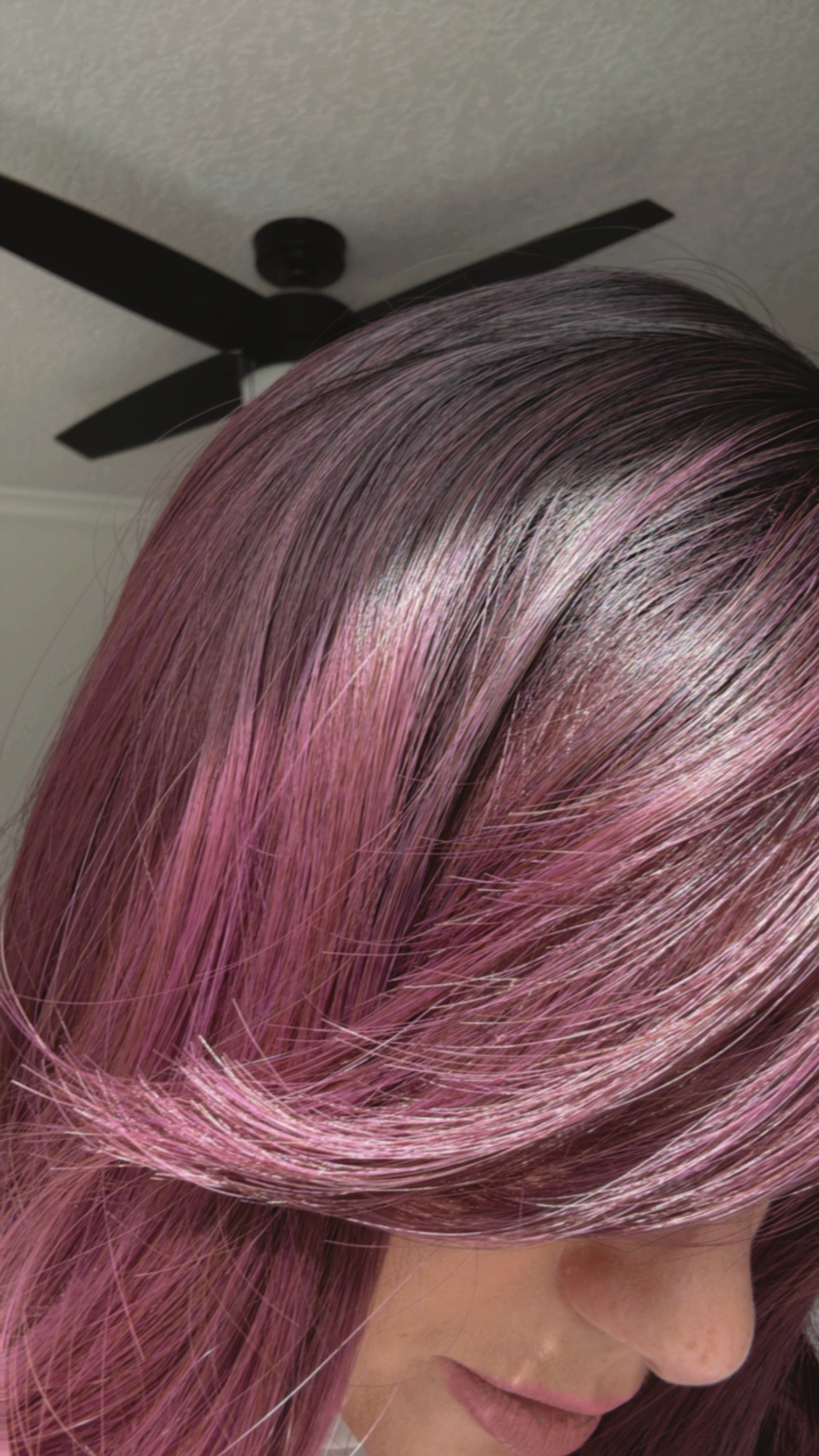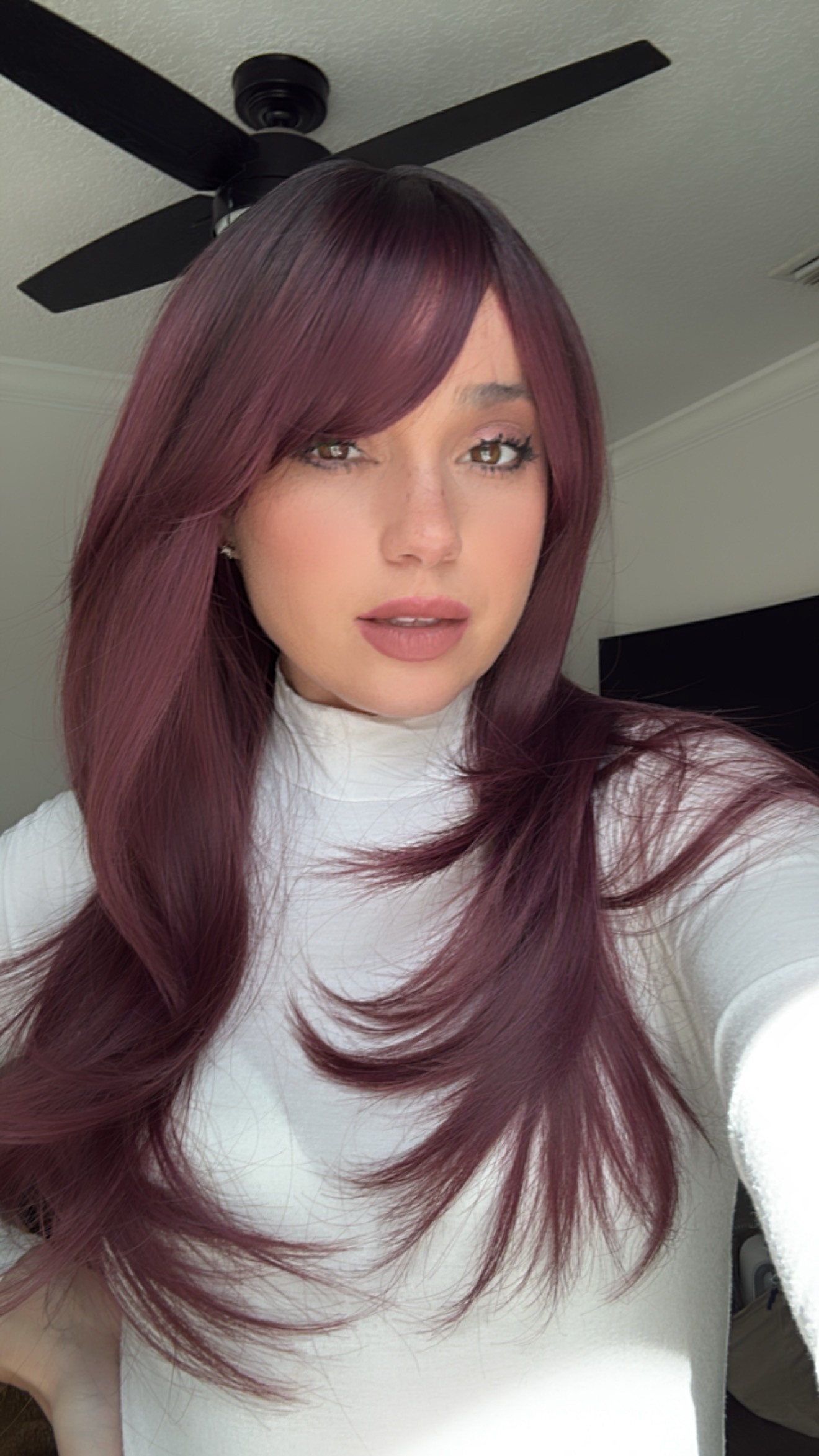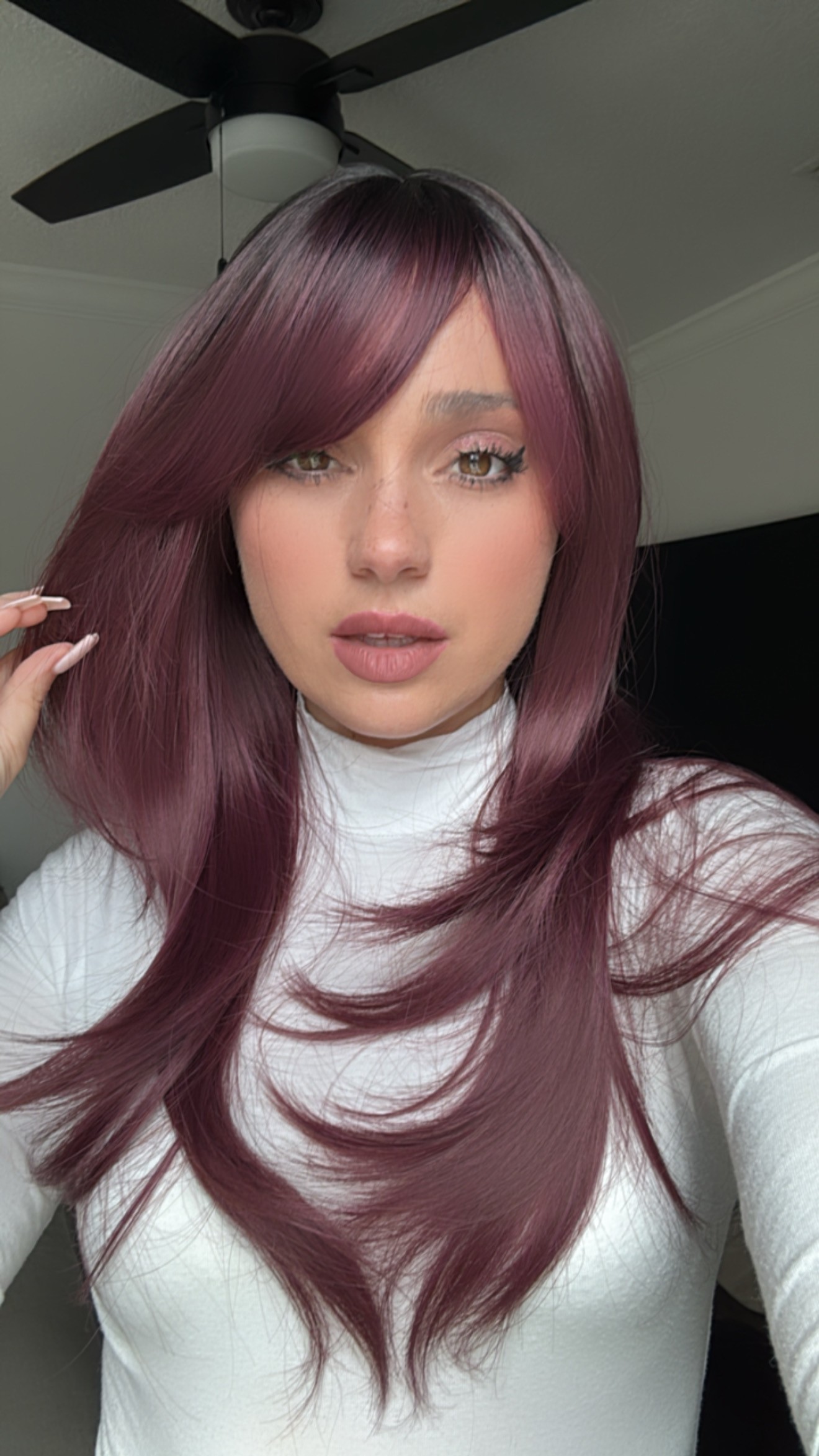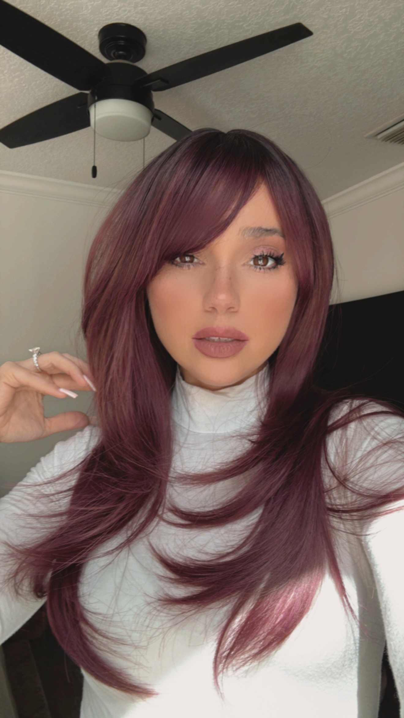 Introducing the stunning EllaRae Rayne Style Wig – your ultimate solution for a quick and stylish hair transformation. She is designed in a sophisticated Purple with light purple highlights. Curtain bangs to frame the face.