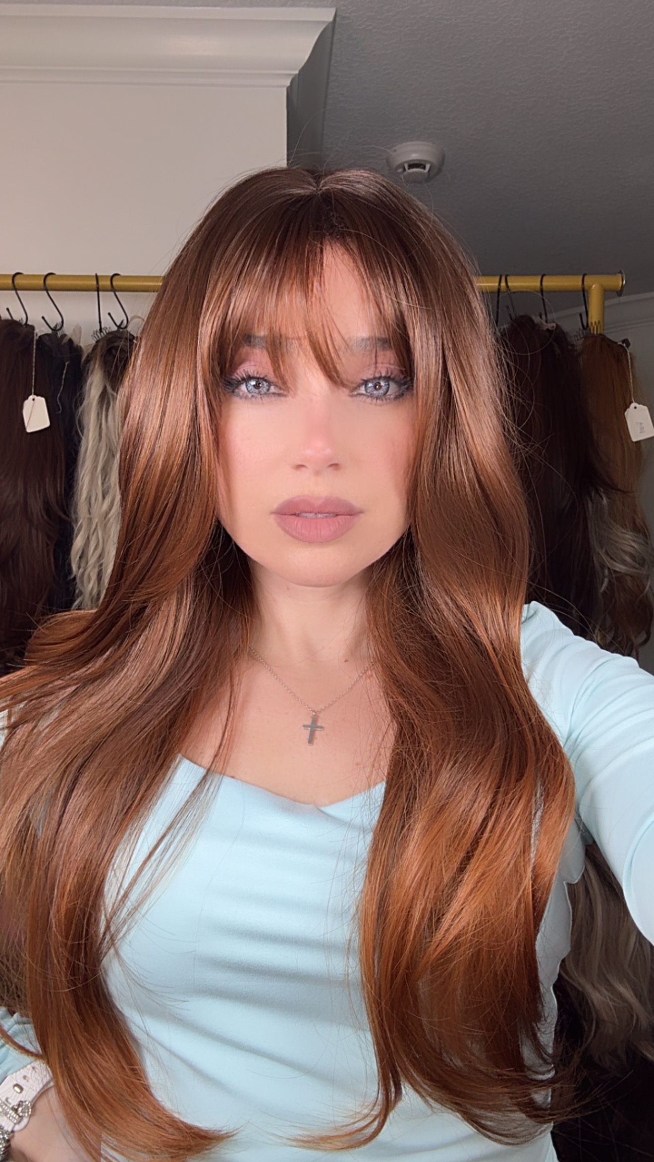 Introducing the stunning EllaRae Auburn Style Wig – your ultimate solution for a quick and stylish hair transformation. This beautifully crafted wig is designed in a sophisticated Auburn, featuring a wavy, mid-length cut complemented by chic bangs that frame the face elegantly.