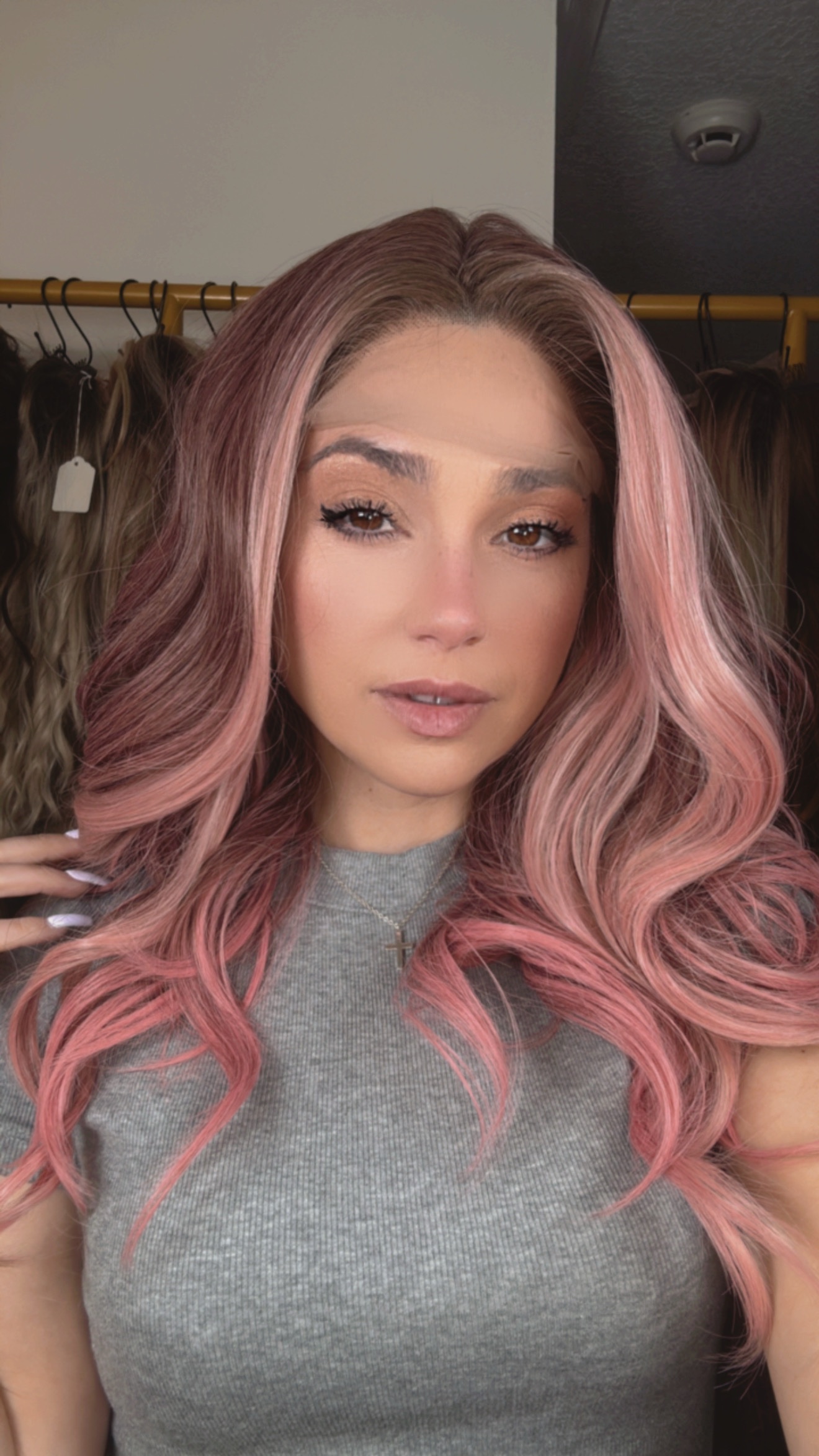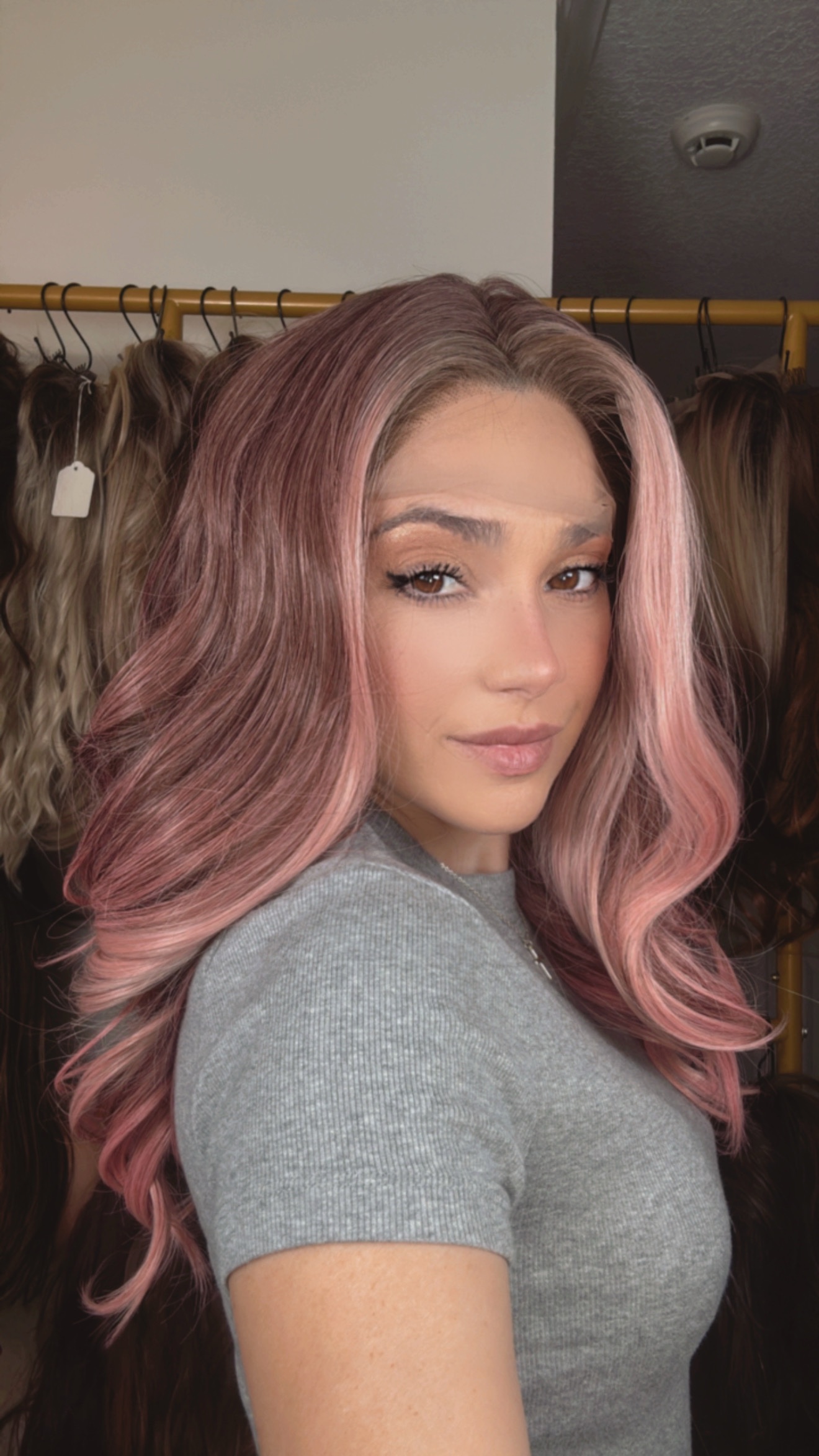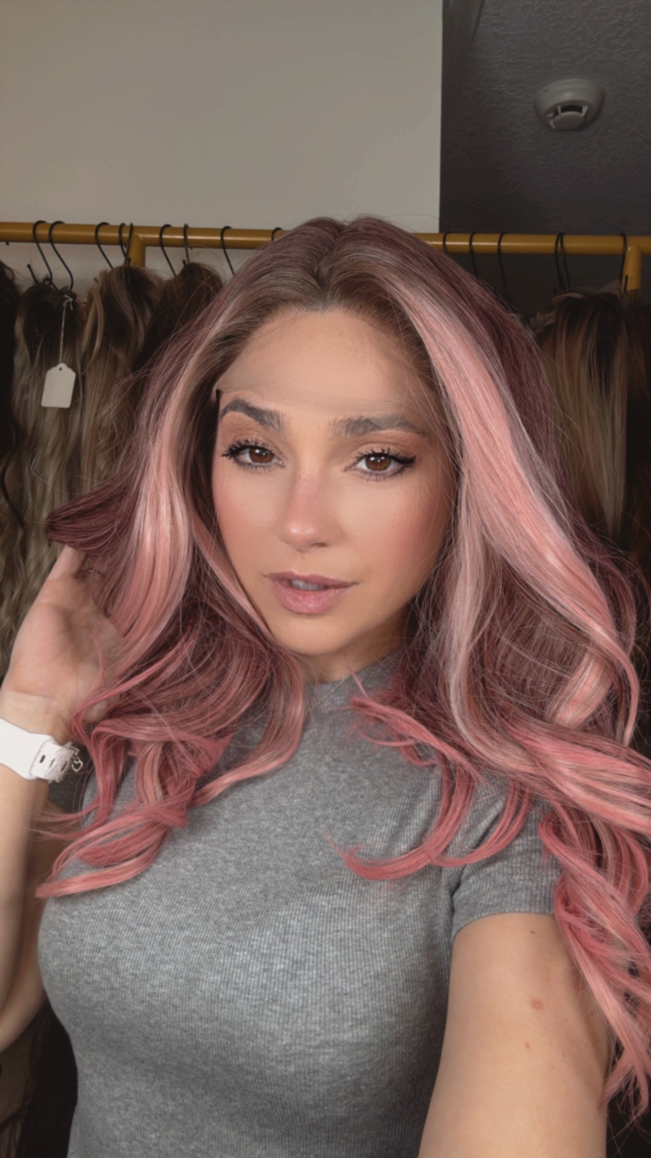 Introducing the stunning EllaRae Jo Style Wig – your ultimate solution for a quick and stylish hair transformation. This beautifully crafted wig is designed in a rooted brunette into a bubble gum pink, featuring beautiful curls.