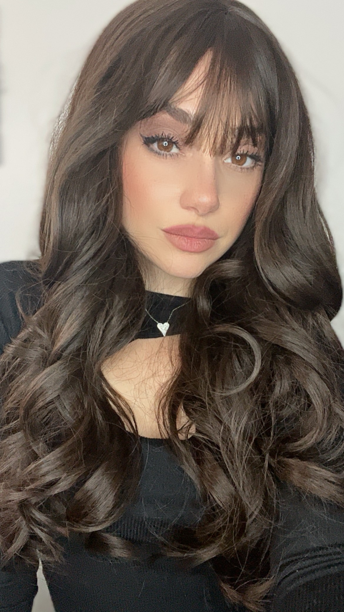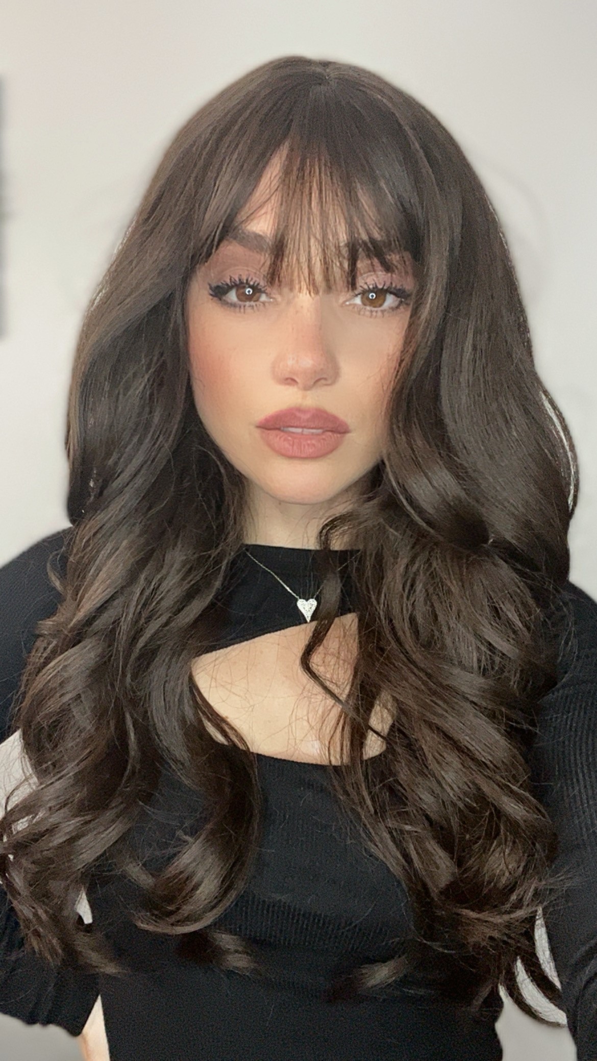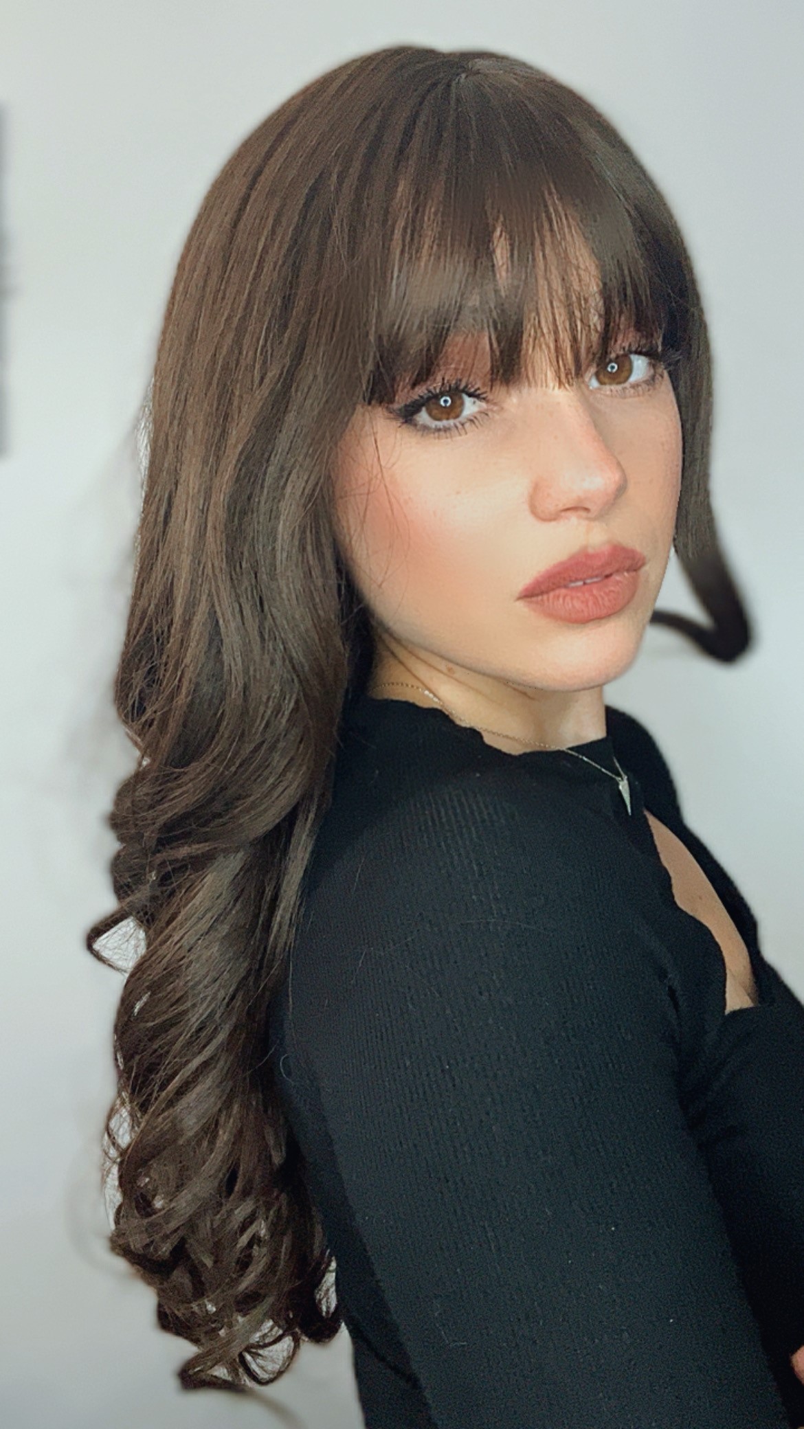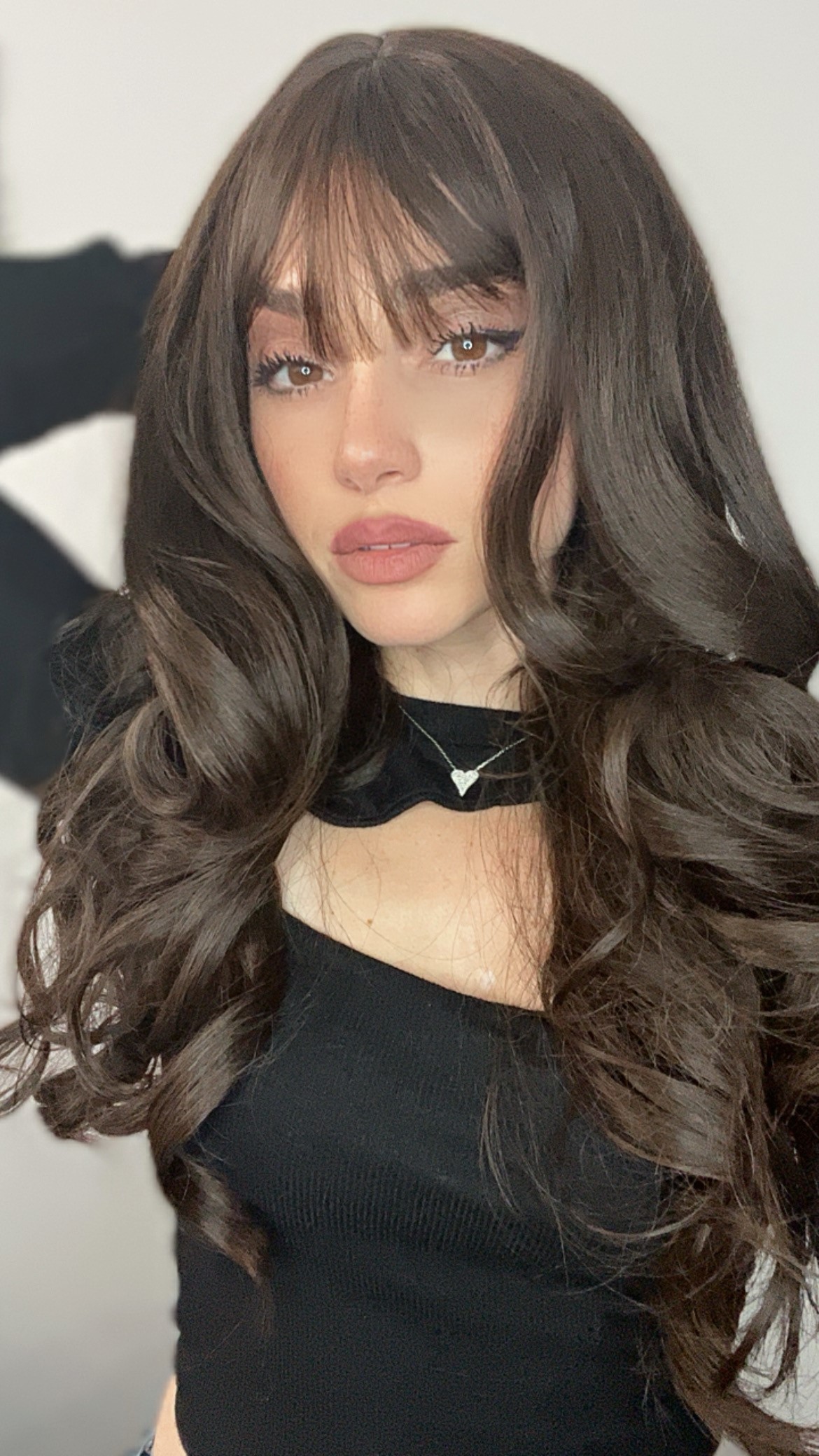Introducing the stunning EllaRae Gemma Style Wig – your ultimate solution for a quick and stylish hair transformation. This beautifully crafted wig is designed in a pretty rich brown color, featuring a curly, mid-length layered cut complemented by chic bangs that frame the face elegantly.