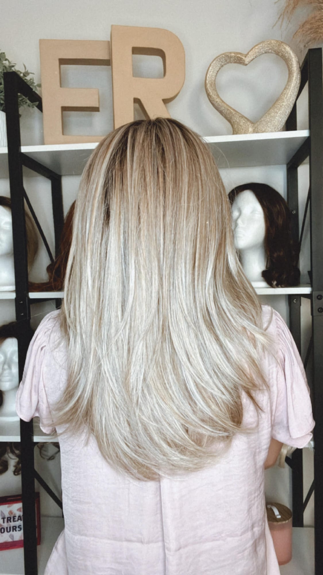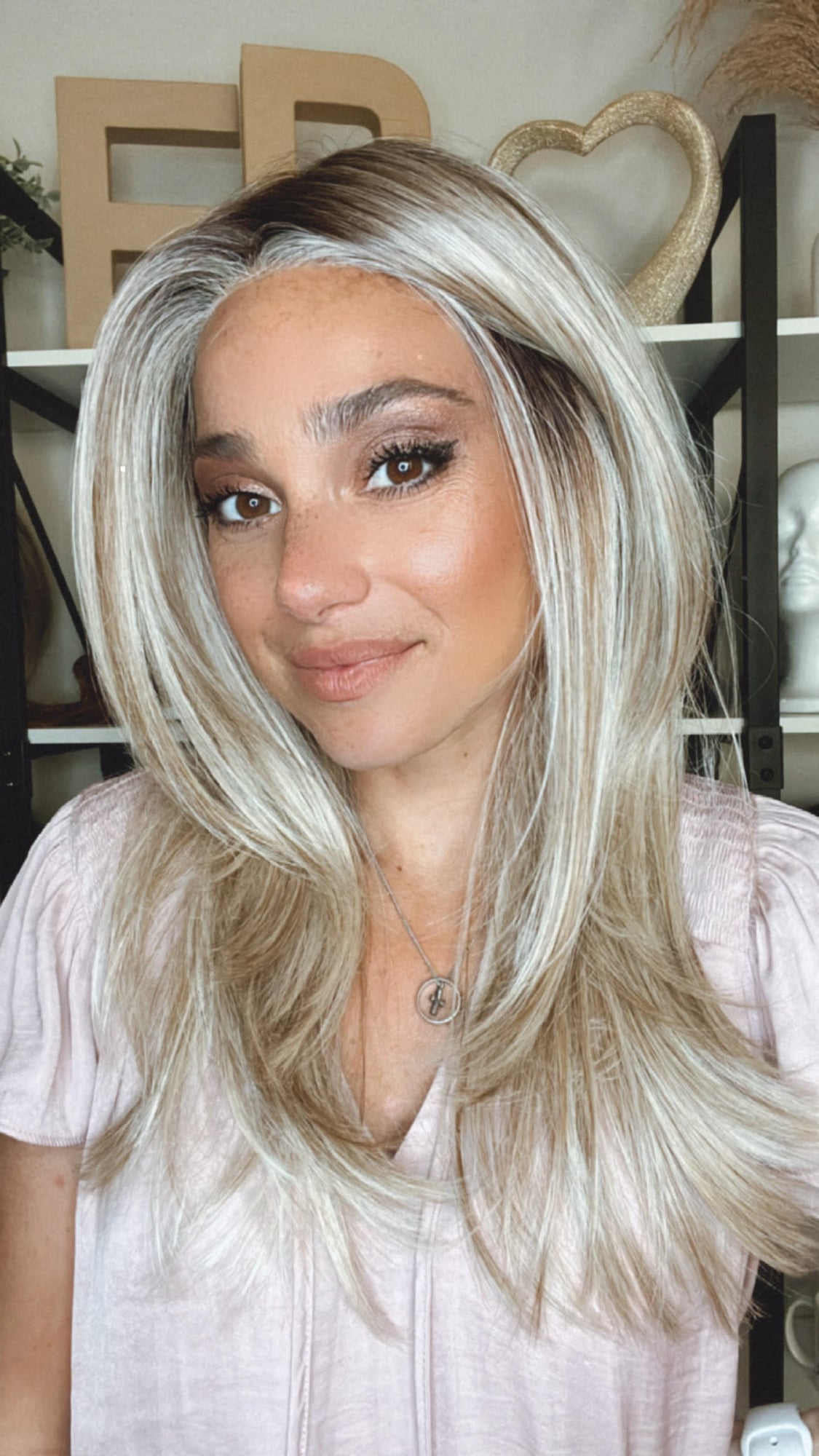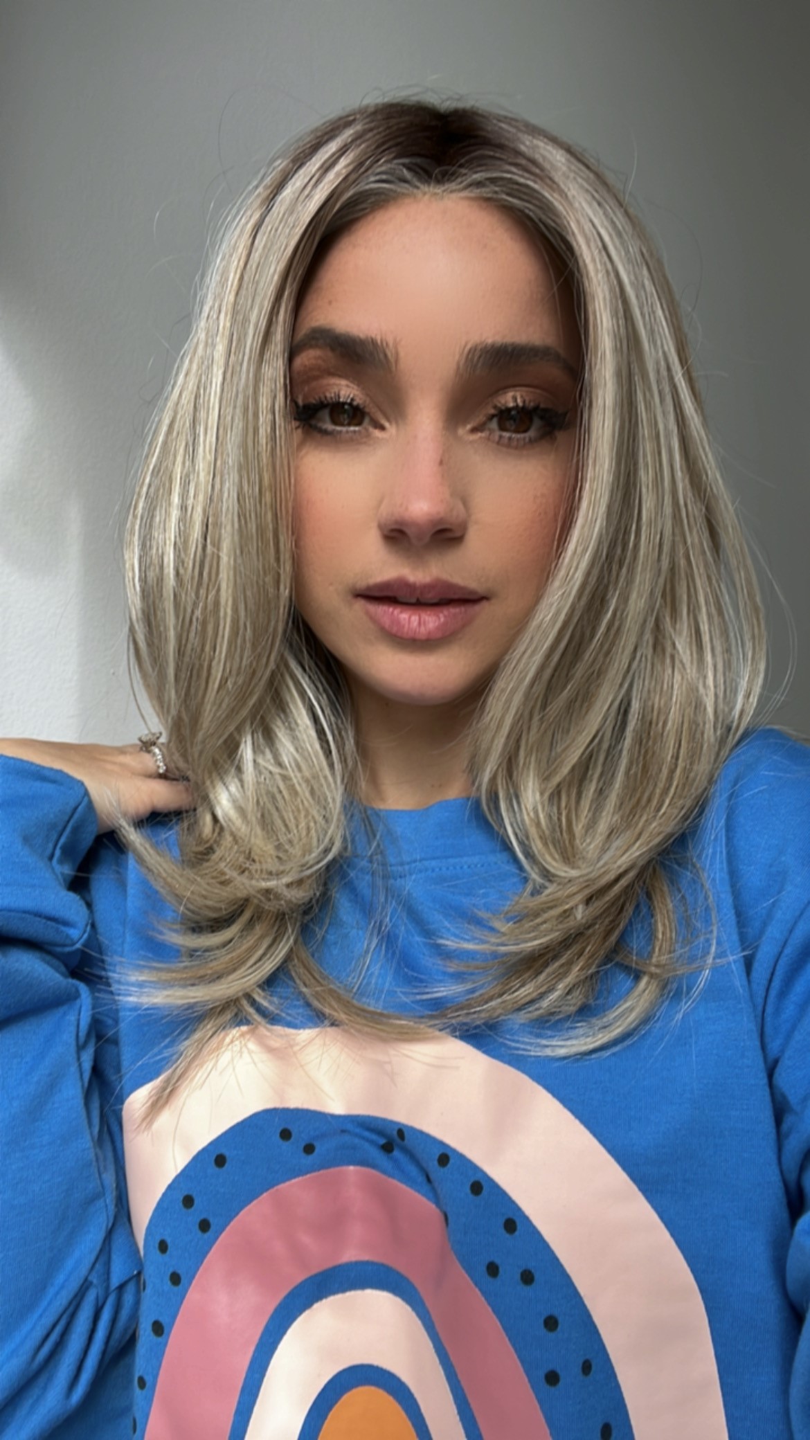 EllaRae | Gisele-Biscotti Blonde | Lace Front Mid-length Layered Cool Blonde with Highlights and Dark Rooting