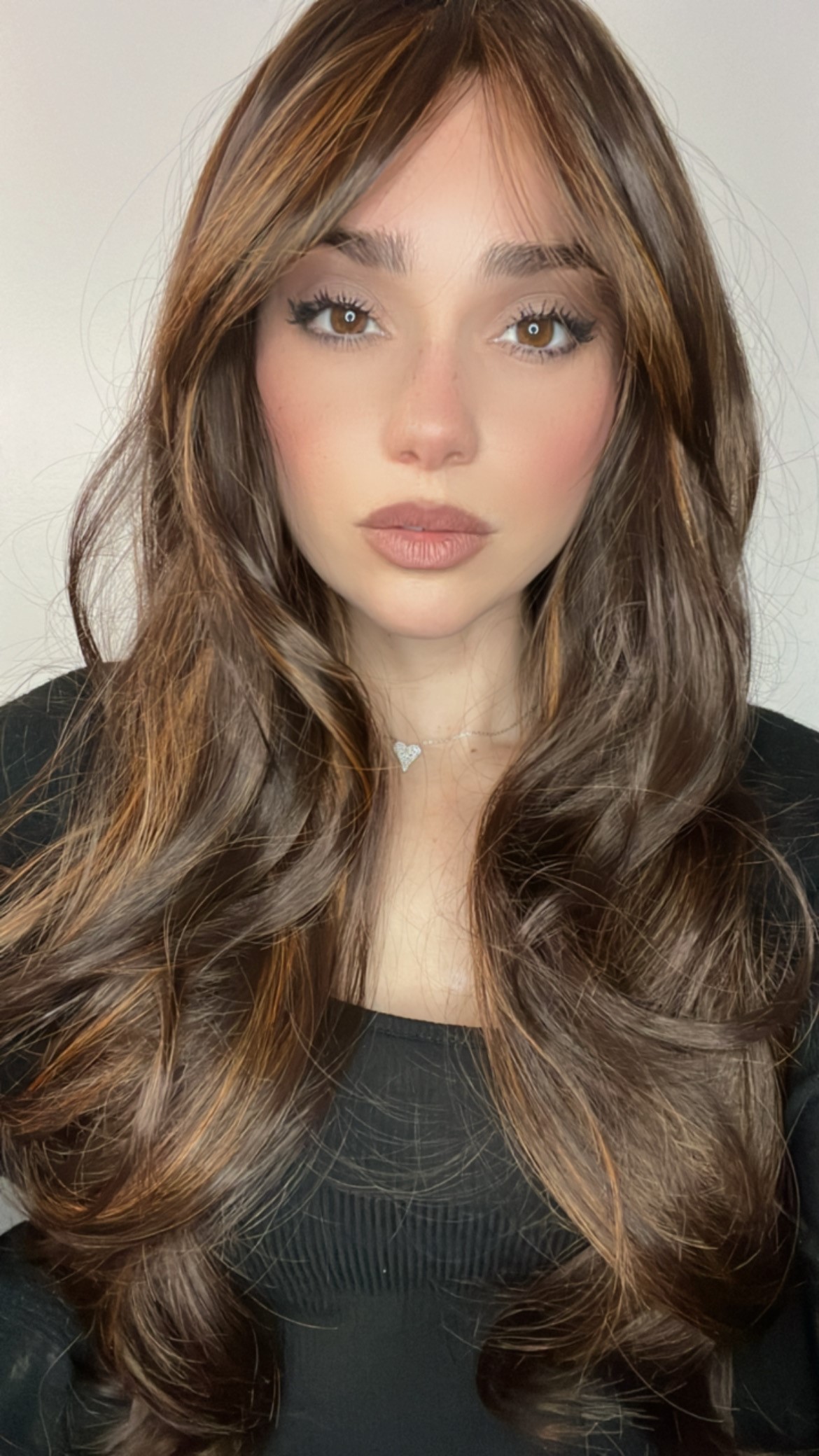 Introducing the stunning EllaRae Remi Style Wig – your ultimate solution for a quick and stylish hair transformation. This beautifully crafted wig is designed in a sophisticated dark brown with pumpkin spice highlights, featuring a wavy, long-length cut complemented by chic bangs that frame the face elegantly.