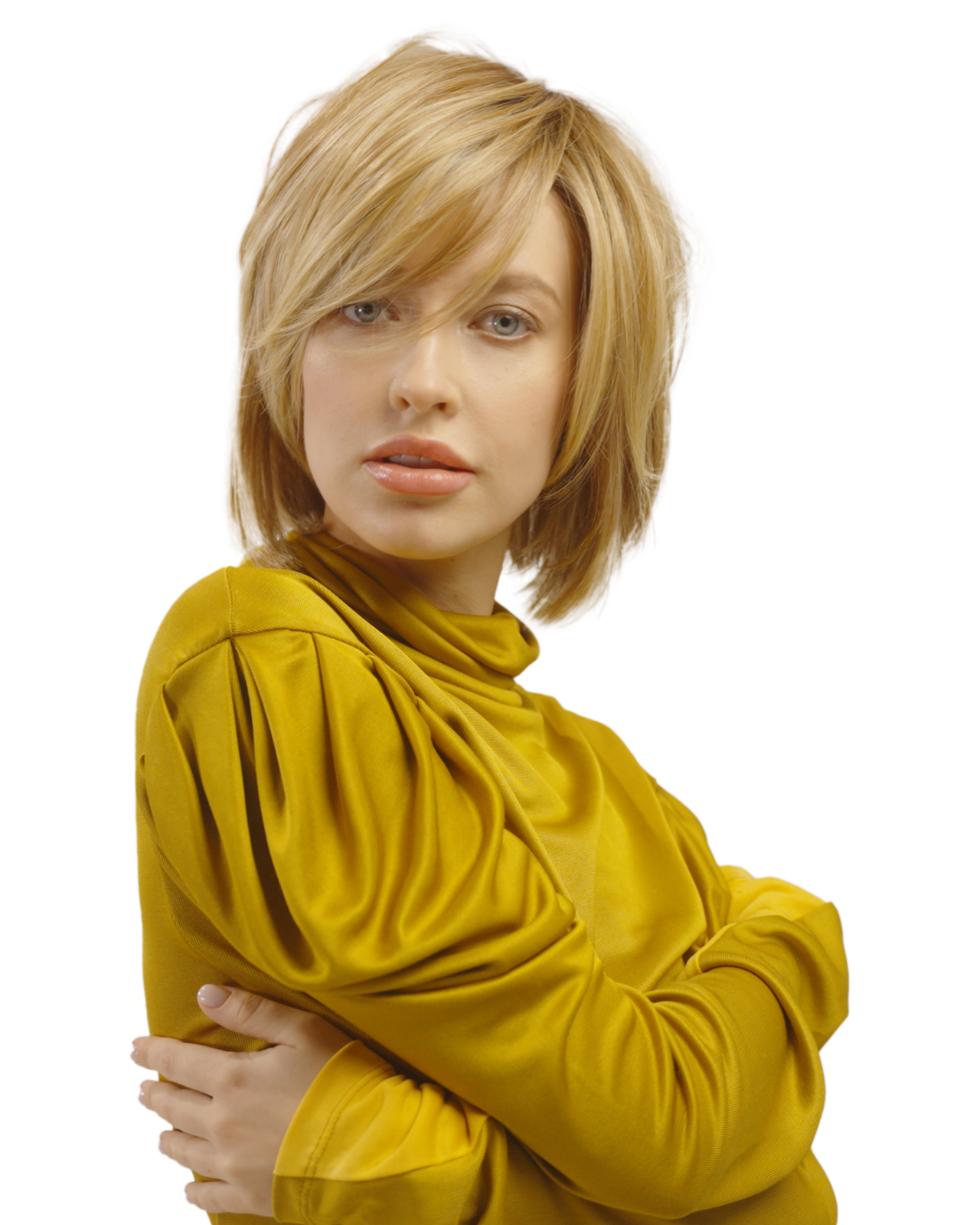 Sheer Joy is a low density silky layered bob with a very slight wave that falls just below the collar, that will part anywhere.